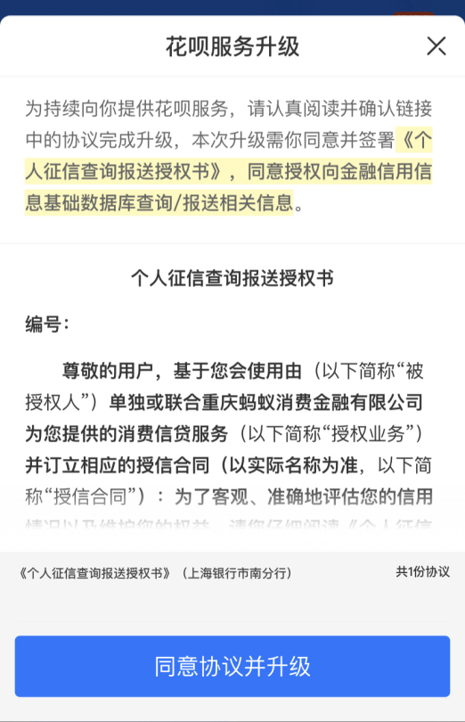 近日,有多位花呗用户表示,收到“花呗服务升级”提示,显示用户需签署《个人征信查询报送授权书》(以下简称《授权书》),同意授权向金融信用信息基础数据库查询/报送相关信息。