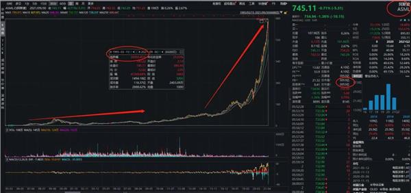 虽然近期股价出现回调,但阿斯麦股价仍高达745.11美元,市值3053亿美元,相当于1.97万亿人民币。目前A股市值唯一高于阿斯麦的只有贵州茅台,茅台市值2.3万亿人民币,2001年8月上市以来涨幅384倍。