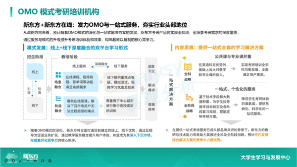 接下来,我将从新东方的整个考研业务来举例。目前从事考研业务的,有做设备硬件的,有做技术支持的,有做资源分享的,总体而言,市场上越来越多的考研教学和服务的提供商,依托线上+线下的OMO一站式解决方案,进行深度整合,在未来将是一个大的趋势,而这种模式已是新东方大学生学习与发展中心的服务特色。