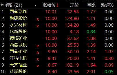 今日A股三大指数集体收涨,其中沪指上涨0.39%,收报3630.11点;深证成指上涨0.83%,收报14837.87点;创业板指上涨1.06%,收报3328.56点。此前持续大跌的锂电池板块今天集体暴涨,锂矿板块掀起涨停潮。截至收盘,西藏珠峰、融捷股份、永兴材料等6只锂矿股涨停,西藏矿业、江特电机、天齐锂业、盐湖股份等10股涨逾5%。