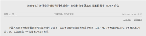 6月20日,人民银行授权全国银行间同业拆借中心公布了新一期贷款市场报价利率(LPR)。其中,1年期LPR为3.55%,上月为3.65%;5年期以上LPR为4.2%,上月为4.3%。1年期LPR、5年期以上LPR均较上月下降10个基点。