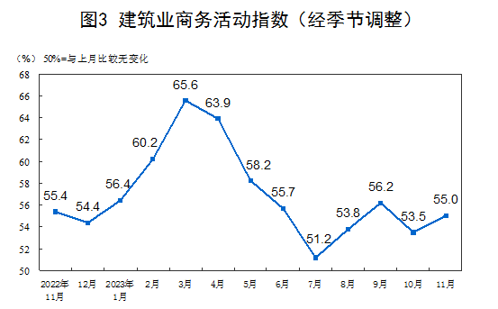 分行业看,建筑业商务活动指数为55.0%,比上月上升1.5个百分点;服务业商务活动指数为49.3%,比上月下降0.8个百分点。从行业看,水上运输、电信广播电视及卫星传输服务、货币金融服务等行业商务活动指数位于55.0%以上较高景气区间;房地产、租赁和商务服务等行业商务活动指数低于临界点。