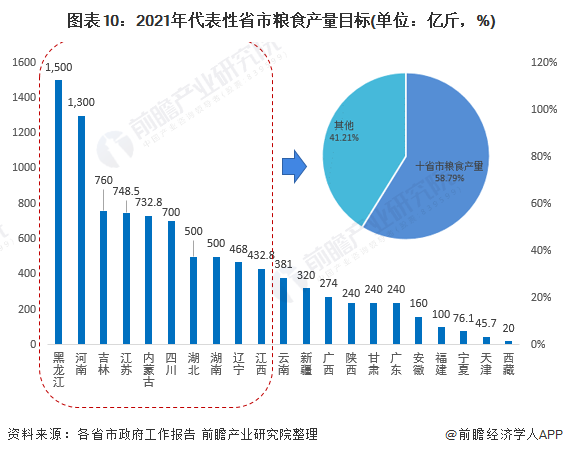 2021年全国粮食产量超过1.3万亿斤,与2020年66949万吨的粮食产量基本持平。其中以云南、黑龙江、广西、河南、广东等为代表的十个地区粮食产量目标合计7462.1亿斤,占全国粮食目标的58.79%,超五成。