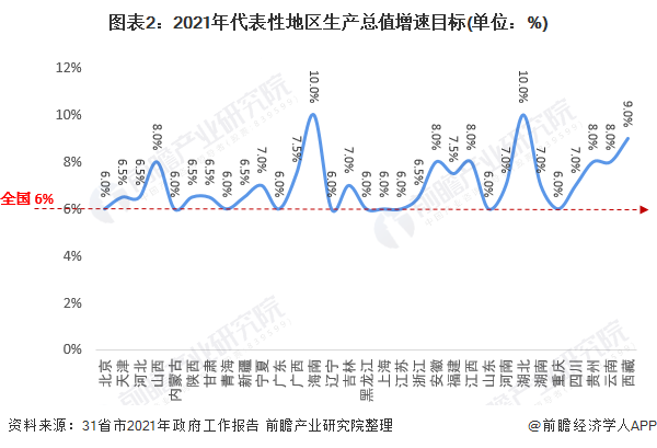 从各省市2021年政府工作报告规划看,各省市结合地区经济发展实力及经济发展规划,参考全国经济发展目标,制定地区生产总值增速目标。总体看,31个省市地区生产总值目标均不低于全国经济增长目标。其中,11个省份经济增长目标与全国同步,其余20个省市目标超过全国,以海南和湖北两省经济增长预期目标最高,为10%。