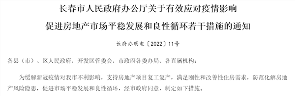 5月6日,长春发布《关于有效应对疫情影响促进房地产市场平稳发展和良性循环若干措施》,从调整信贷政策、减轻企业资金压力、绿色通道支持政策、促进市场交易、加强市场监管等5个方面出台了20项政策措施。
