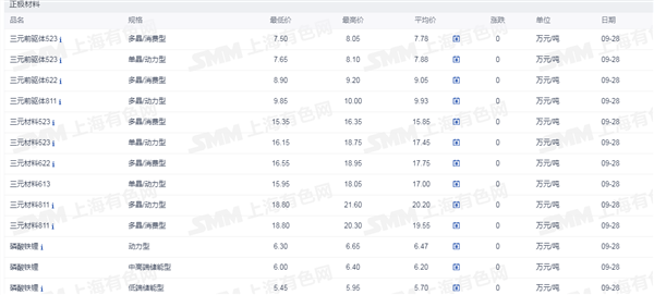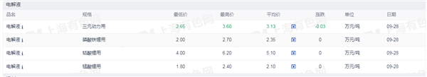 证券之星新能源车行业周报:据上海有色网,截止9月28日,电池级碳酸锂16-17.8万元/吨,均价16.9万元/吨,环比上一工作日持平;工业级碳酸锂15-16.2万元/吨,均价15.6万元/吨,环比上一工作日持平。今日已是国庆小长假前的前夕,下游多数厂家已于前期完成节前小幅补库,当前市场总体成交依旧偏淡。