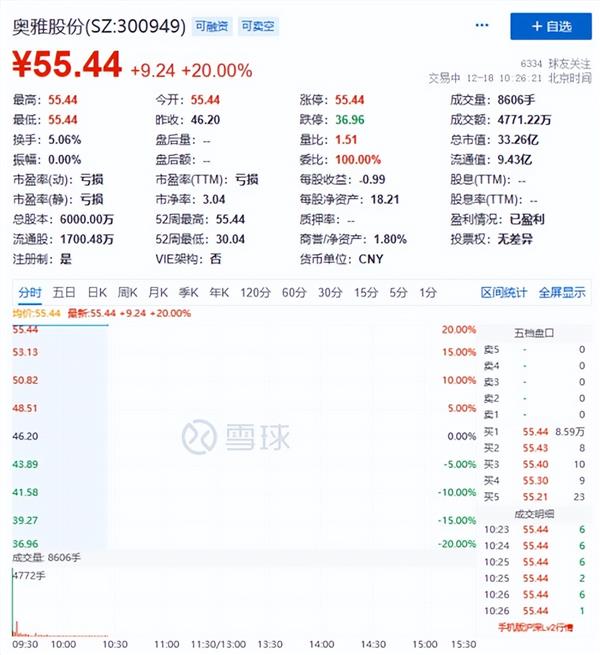 12月18日上午,奥雅股份开盘即封上20CM涨停,总市值为33亿元。
