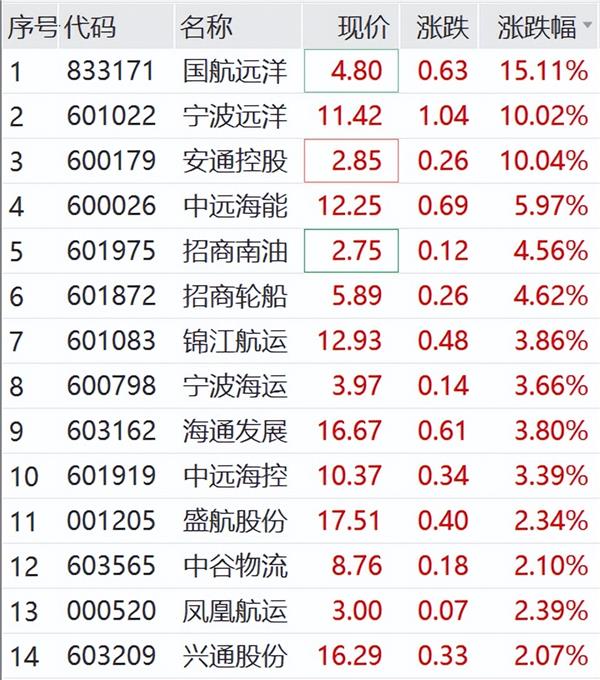 12月18日上午,海运指数领涨市场。宁波远洋开盘即封涨停板,安通控股拉升封板,国航远洋最高涨近25%;招商轮船、中远海能、招商南油等多股大涨。
