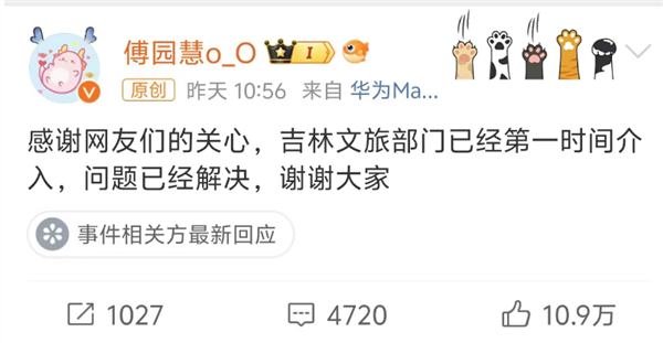 2月17日10时56分,傅园慧再次发文:“感谢网友们的关心,吉林文旅部门已经第一时间介入,问题已经解决,谢谢大家 。”