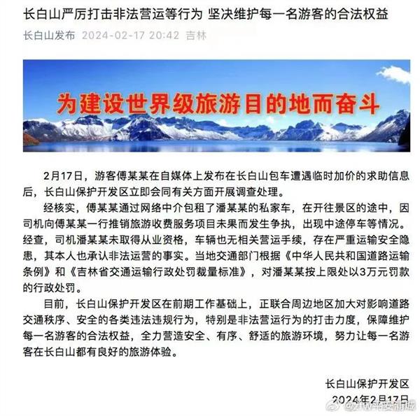 2月17日20时42分,“长白山发布”发布一则题为“长白山严厉打击非法营运等行为 坚决维护每一名游客的合法权益”的通告:2月17日,游客傅某某在自媒体上发布在长白山包车遭遇临时加价的求助信息后,长白山保护开发区立即会同有关方面开展调查处理。