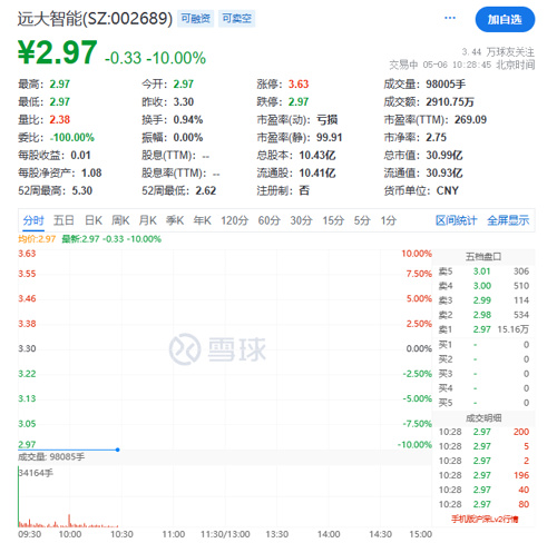 5月6日,远大智能开盘跌停,股价报2.97元/股,跌幅为10%,当前总市值仅为31亿元。截至发稿,远大智能跌停封单超15万手。