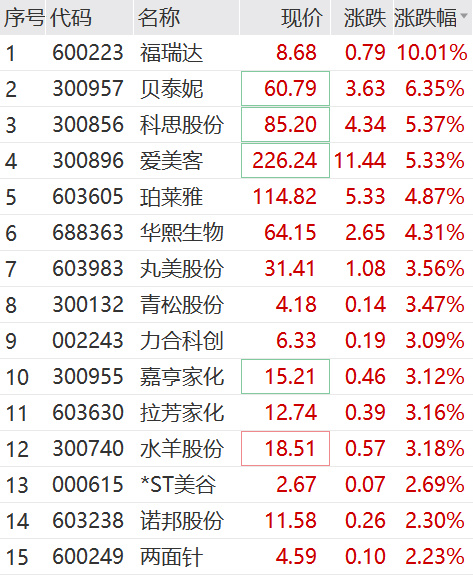 美容护理板块中,福瑞达开盘迅速封住涨停,贝泰妮、爱美客、珀莱雅等权重股走高。