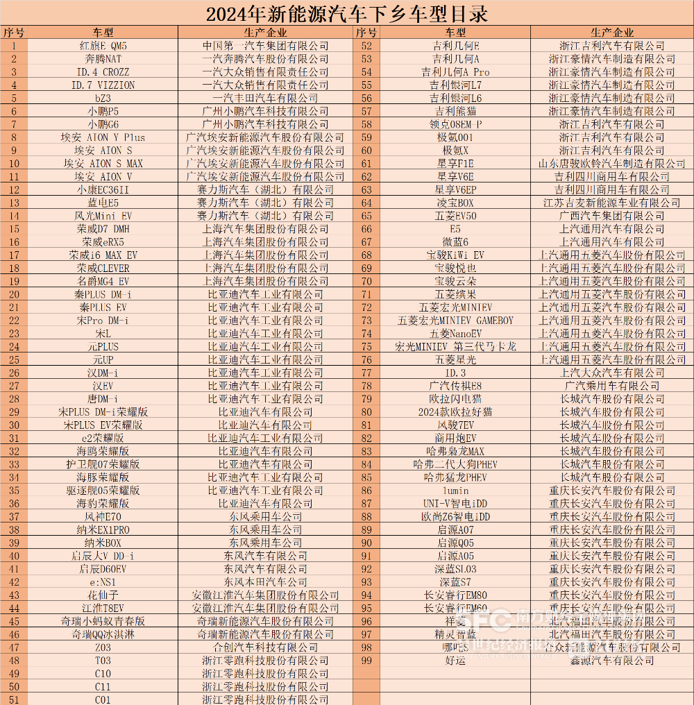 附:2024年新能源汽车下乡车型目录