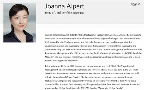 孙悦正是这个新部门的负责人,Karniol-Tambour在信中表示,孙悦现在“正肩负桥水基金这一关键业务的重任”。目前桥水官网已经更新了她的职务。