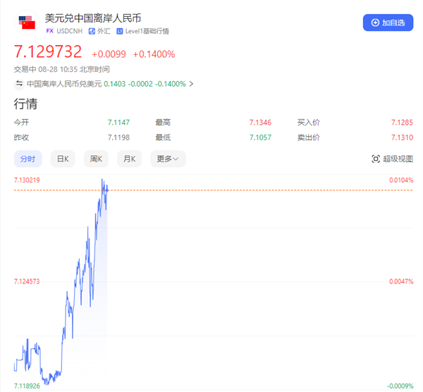 此外,离岸人民币兑美元日内跌超100点。
