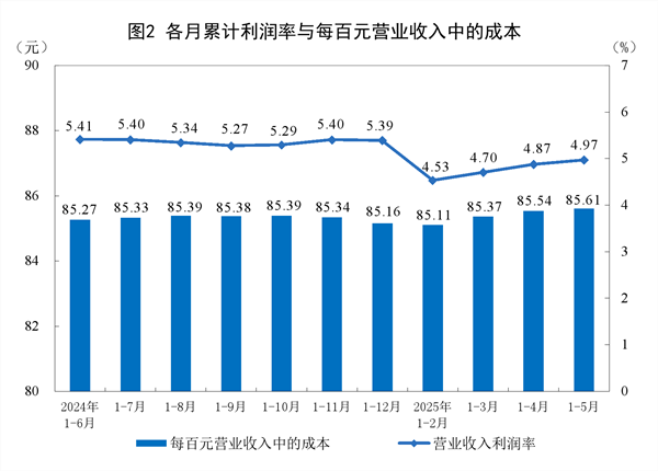 1—5月份,规模以上工业企业每百元营业收入中的成本为85.61元,同比增加0.24元;每百元营业收入中的费用为8.29元,同比减少0.14元。