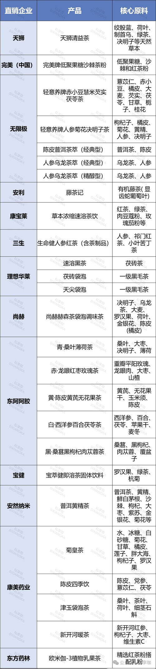 据不完全统计,共有16家直销企业推出了多款茶产品,可分为原茶、茶饮和茶衍生品三大类别。