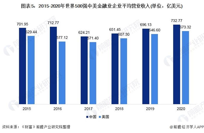 从“财富中国500强”与“《财富》美国500强”榜单中美金融业企业营收规模来看,2019年中国企业平均营业收入超越美国,2020年达到343.61亿美元。而美国企业平均营业收入虽然在2017年开始逐年增长,但中国企业增长势头强劲,逐渐拉开差距。