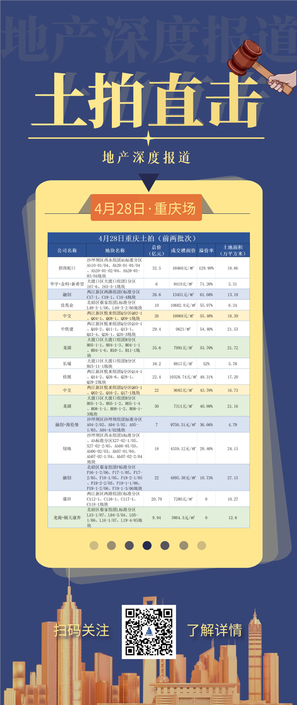 4月28日,重庆迎来了首次集中土拍,房企对热点地块抢夺热情不减,多宗地高溢价成交。