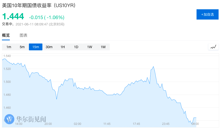 数据公布后,10年期美债收益率短线跃升,一度重上1.53%刷新日高,美股盘前开始回落,盘初即回到1.50%下方,此后继续下行,徘徊在三个月来低位。