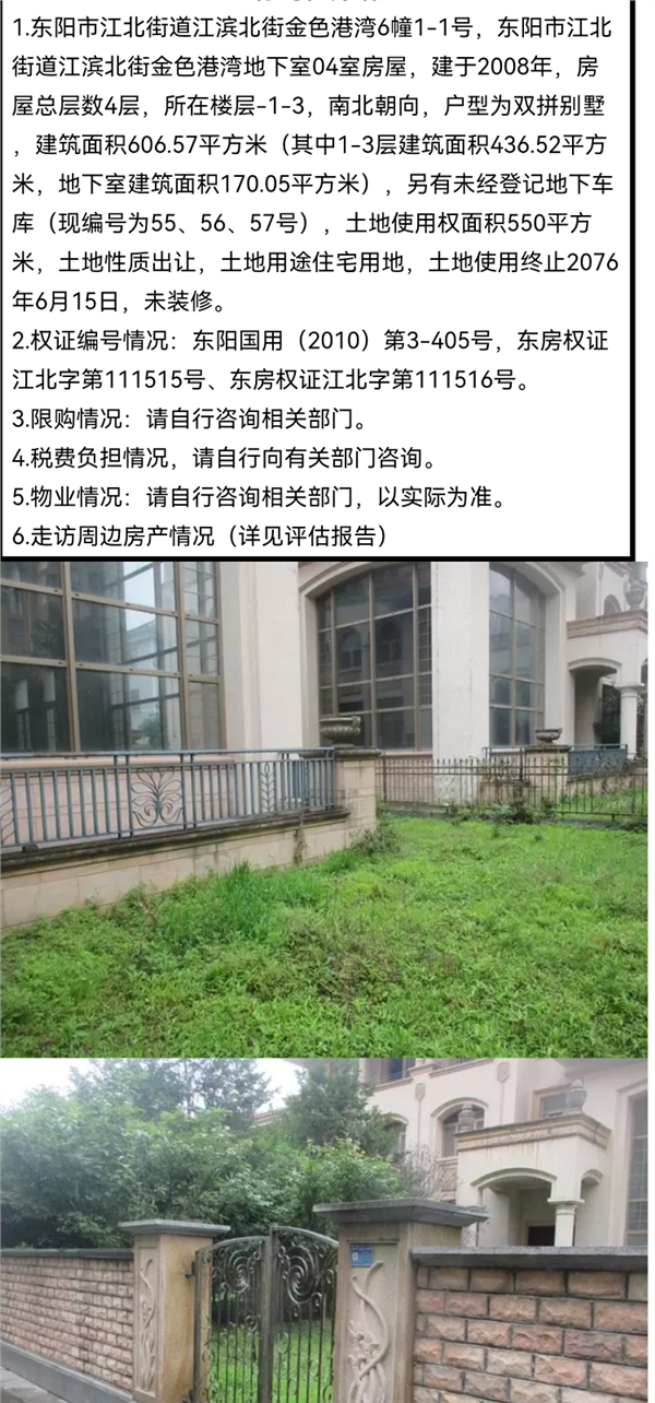 阿里拍卖信息显示,8月2日起至8月5日期间,浙江省金华市中级人民法院每天都将以1312万元的起拍价开拍一套别墅,合计四套,每套评估价约为1640万元。