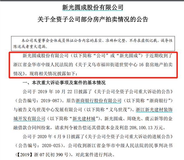 更早之前,2020年11月16日、17日,浙江省金华市中级人民法院通过阿里拍卖平台拍卖了被执行人义乌世茂(系新光控股全资子公司)名下20套房地产,拍卖总价约1亿元。