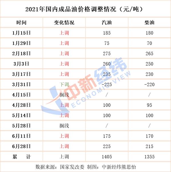 中新经纬客户端梳理发现,2021年以来,国内成品油调价已进行了十二轮,汽油总计上调1405元/吨,柴油总计上调1355元/吨,呈现“九涨一跌两搁浅”的格局。如果本轮上调预期落实,2021年的调价格局将呈现“十涨一跌两搁浅”。