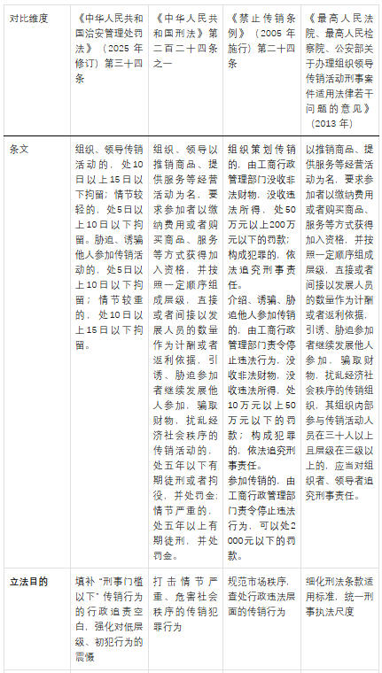 3.《禁止传销条例》作为行政基础法规,既规制全链条参与者,也为前两者提供行为界定依据(如三类传销行为列举),形成 “治安拘留(轻)- 行政罚款(中)- 刑事处罚(重)” 的梯度。