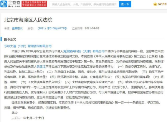 裁定书显示,通过最高法院查控系统对被执行人的银行存款、车辆、房产、股权及其他财产等进行调查,未发现可供执行的财产,法院已对被执行人进行高消费限制等。