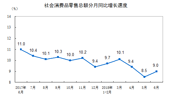 2018年6月份社会消费品零售总额增长9.0%