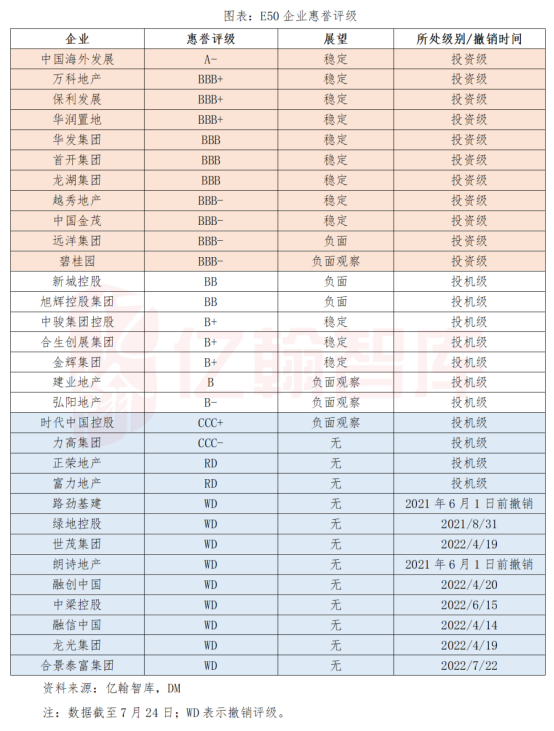 具体而言,E50企业中,穆迪21%企业为投资级,其中仅龙湖一家民企;惠誉35%为投资级,其中仅龙湖、碧桂园两家民企;标普16%企业为投资级,其中仅龙湖一家民企。