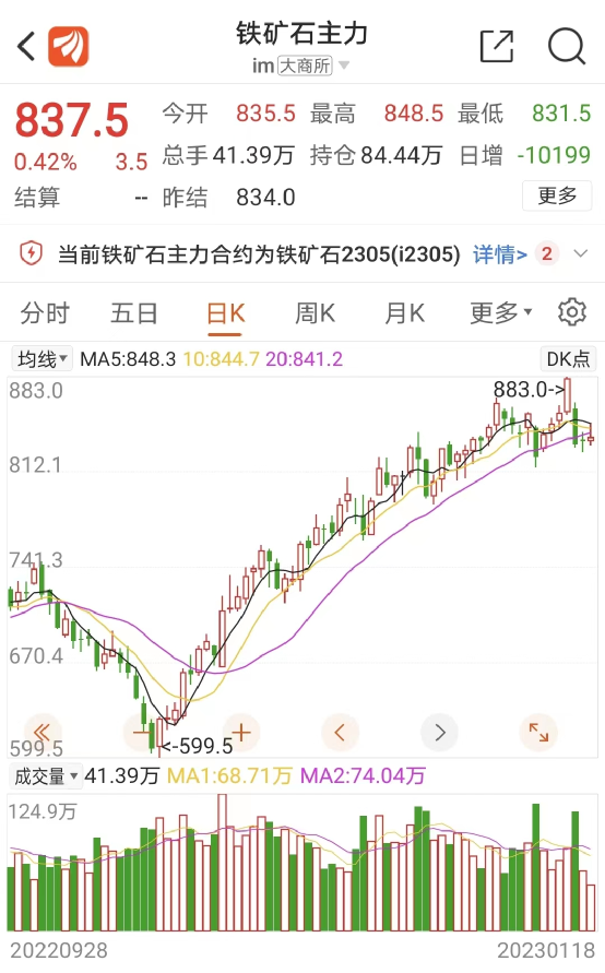 从2022年11月1日至2023年1月13日(上周五),大商所铁矿石期货主力合约从599.5上涨到883,涨幅达47.3%,13日大涨3.4%。