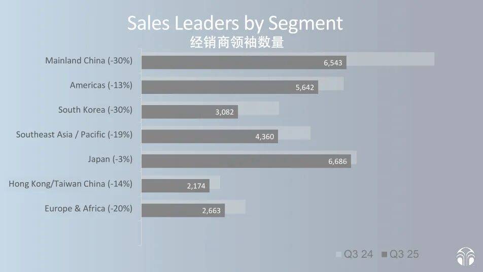 三季度客户数量方面,中国区106062人,同比2024年三季度的148402人,减少了超过4万人,同比跌幅高达29%;销售领袖从去年三季度的9348人,跌至现在的6543人,跌幅达到了30%。