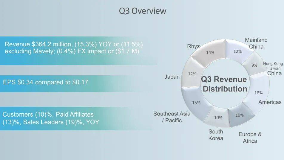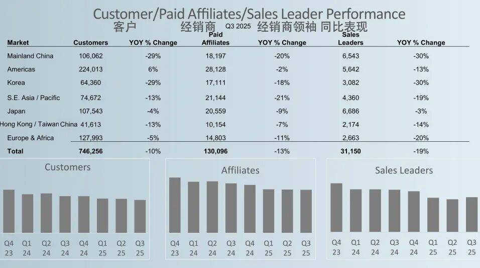 三季度,虽然各市场区域净销售额全线下滑,但如新的经销商领袖数量环比有所增长;中国区业绩4250万美元(约合3亿元人民币),同比下滑20%,中国区经销商人数同比减少20%…
