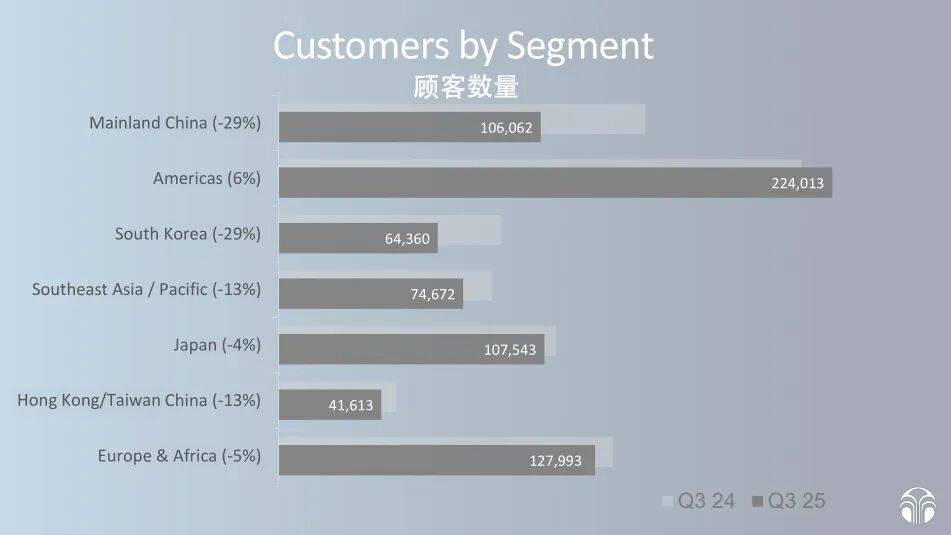 中国区4250万美元的销售额(约合3亿元人民币),同比2024三季度下跌了20%;环比二季度的5320万美元,也减少了超过1000万美元,相当于单季度减少了7100万元人民币的销售额。三季度中国市场业绩占如新全球份额的12%,仅和日本持平,已经落后于美洲的18%和东南亚/亚太区的15%。