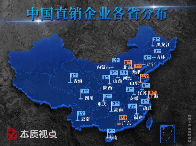根据统计结果可以看到,目前有22个省级区划有拿牌直销企业。直销企业注册地分布最多的前五个省份为广东省(13家)、山东省(11家)、上海市(9家)、北京市(8家)和天津市(7家)。