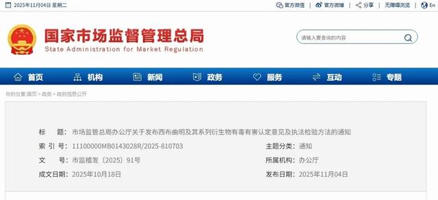 11月4日,国家市场监督管理总局批量发布关于非法添加非食用物质系有毒有害认定意见及执法检验方法的通知。