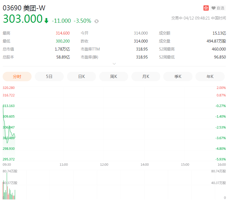 开盘后,美团港股跌幅一度扩大至4.01%,腾讯控股和京东集团跌超1%。